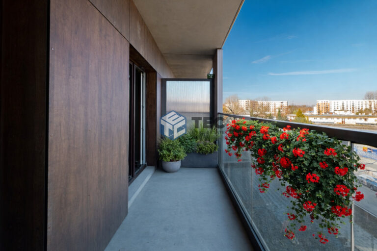 Zielony taras stanowi prywatną, kameralną przestrzeń wypoczynkową — idealną na strefę relaksu lub ogród miejski.