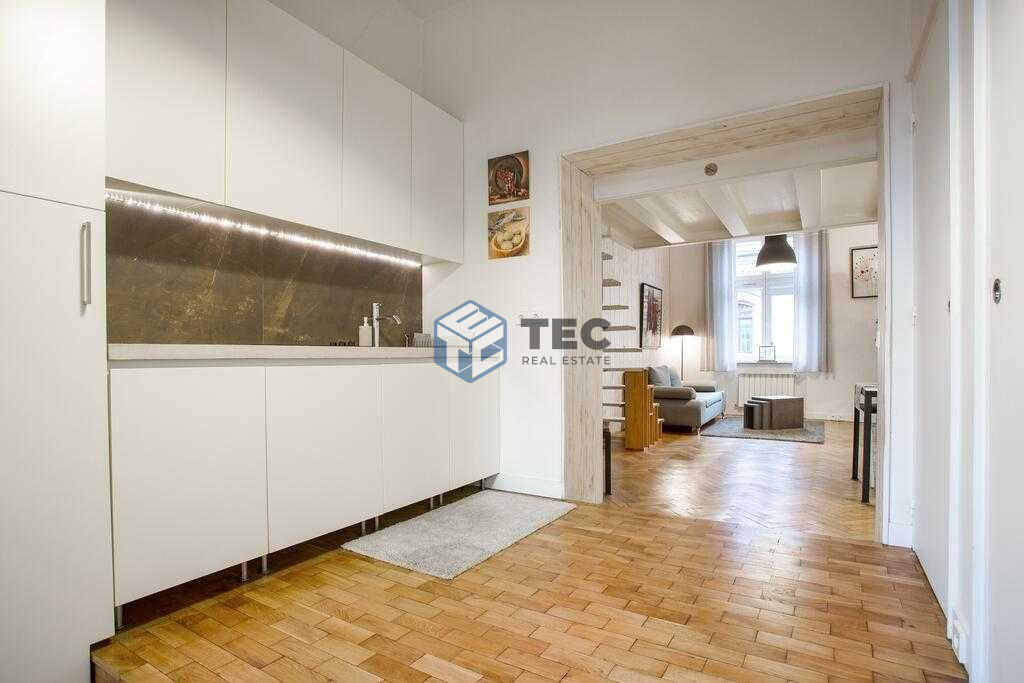 Większe mieszkanie z przestronnym pokojem, antresolą ,kuchnią , łazienką oraz osobną toaletą.