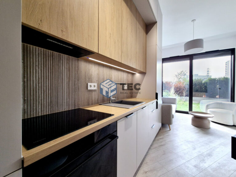 Kuchnia: meble w zabudowie kuchennej, płyta grzewcza, lodówko-zamrażarka okap, zmywarka i piekarnik; stół z 2 krzesłami.