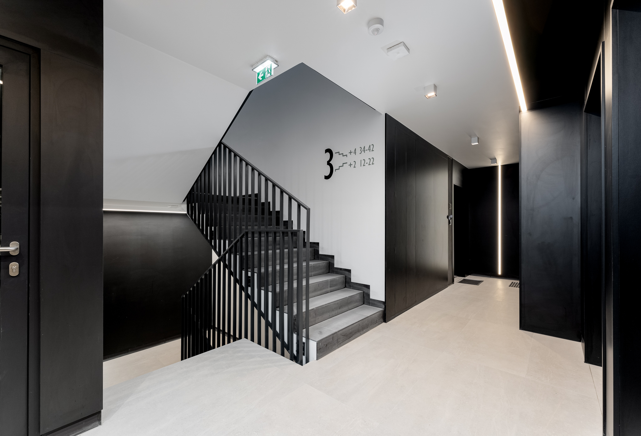 Budynek V-cio piętrowy z niebanalną architekturą i ciekawym wykończeniem elewacji oraz części wspólnych, do czego wykorzystano materiały wysokiej jakości. Budynek posiada monitoring, 2 windy, garaż podziemny z komórkami lokatorskimi, a na parterze 7 lokali usługowych. Miejsca postojowe również na zewnątrz – Goście są zawsze mile widziani! W garażu podziemnym dostępne miejsca postojowe dla rowerów. Do dyspozycji teren rekreacyjny – uroczy skwer dla mieszkańców.